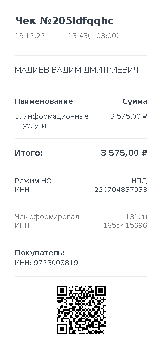 | receipt | string | Ссылка на чек. Необязательное поле, по умолчанию не добавляется! | https://lknpd.nalog.ru/api/v1/receipt/220704837033/205ldfqqhc/print |